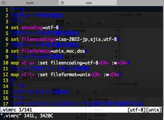 文字コードは非常に厄介です、判定順位によっては文字化けの原因になったりします、気を付けましょう。set encoding=utf-8 "文字コードの判定優先順位 set fileencodings=iso-2022-jp,sjis,utf-8 "改行コードの判定優先順位 set fileformats=unix,mac,dos "Ctrl+uでutf8に変換 map:set fileencoding=utf-8 :w "Ctrl+lで改行コードをLFに変換 map :set fileformat=unix :w