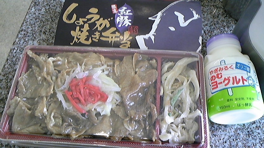 というわけで待ってる間にお昼ご飯(先生のおごり)、わざわざJALの搭乗口からANAまで移動して買ってきた「紅豚生姜焼き弁当」と「やぎみるく のむヨーグルト」