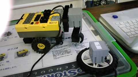 わざわざ自宅から持ってきてくれた自作LEGOにモーターとRCX(上に乗ってる黄色いコンピュータの部分)をつけて動くようにしたもの、大作です!!