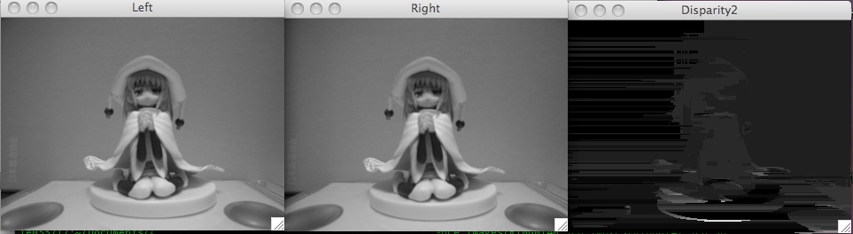 とりあえずデジカメで取り直したもの2枚、maxDisparity(存在しうる最大の視差)を25にした例と255にした例です。つまり奥行きをmaxDisparity段階あると仮定して、それを255以内に正規化したものが出力されるらしい。ちなみにサンプルコードでは25だった。