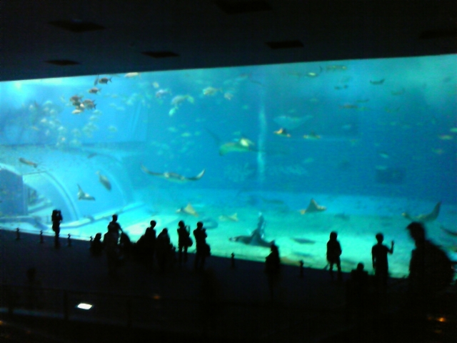 「黒潮の海」はギネス記録(たしか抜かれた)を持つ巨大水槽、端のほう写ってないねこれ、ジンベエサメやマンタが泳いでます。