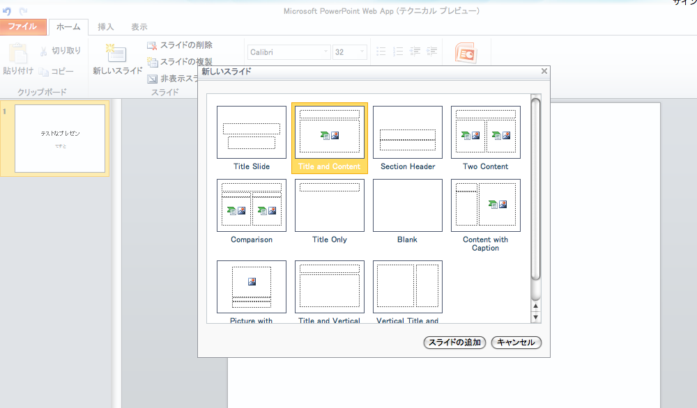 スライドの追加、さすがにソフトウェア版ほどの種類はないがこんだけあれば十分