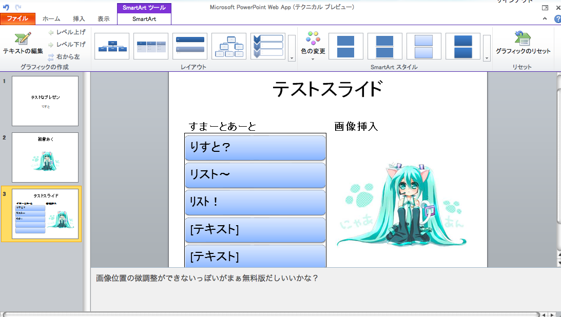 アートイメージ(左側のやつ)はリスト表示を試してみたがきれいにできる、画像表示ももちろんおけ、ノートの追加も出来る。ただ位置の微調整が出来ないのが残念だ。。。