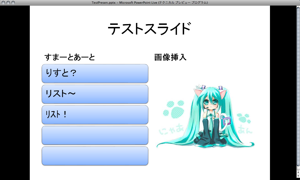 スライドの切り替えが矢印ボタンじゃなくてマウスクリックってとこがあれだが、OpenOfficeとかだと表示がすごいことになるからなぁ、、、