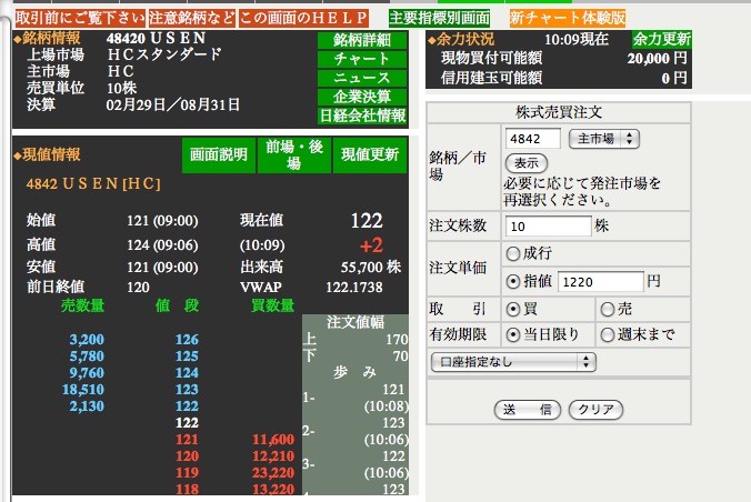 指値もできるらしいが上限値だか下限値だかにひっかかってると言われてできなかった(説明書ちゃんとよんでないww)ので成り行き注文、まぁカクカク上下したりしないだろうと思ったら、、、値段確認して中門ー>約定するまでに下がった(笑)