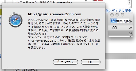 おぃおぃ、下の方にこっそりSafariのウィンドウが出てるじゃねぇかw システムの警告と勘違いさせたかったのかな?