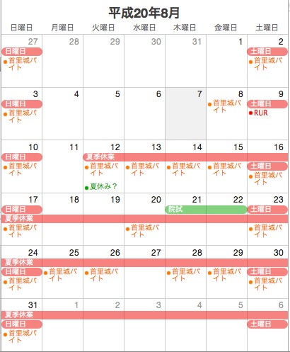 7/20,21,25~27,8/2,3,8,10,12~17,20(院試前日w),23(院試翌日w),24~26,28~31がバイト、あれ?俺夏休み無くね?